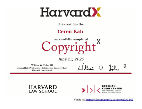 This certifies that Ceren Kalı successfully completed the CopyrightX course on 06/23/2025.