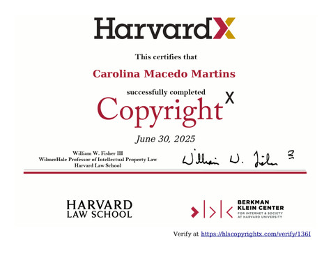 This certifies that Carolina Macedo Martins successfully completed the CopyrightX course on 06/30/2025.