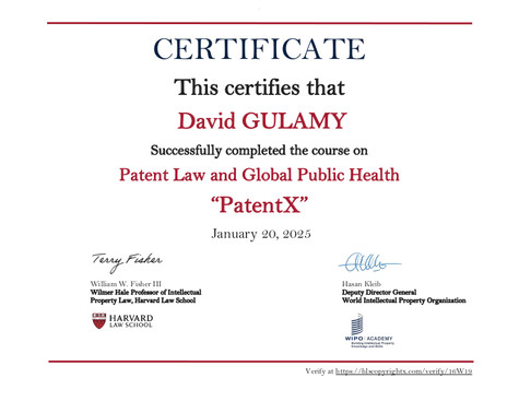 This certifies that David GULAMY successfully completed the PatentX course on 01/20/2025.