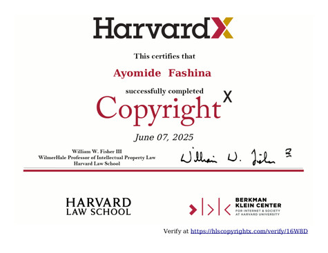 This certifies that Ayomide Fashina successfully completed the CopyrightX course on 06/07/2025.