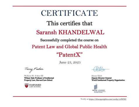 This certifies that Saransh KHANDELWAL successfully completed the PatentX course on 06/23/2025.