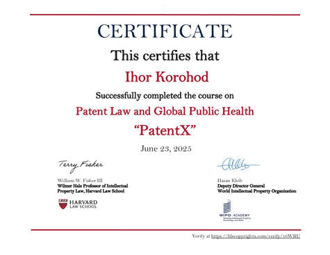 This certifies that Ihor Korohod successfully completed the PatentX course on 06/23/2025.