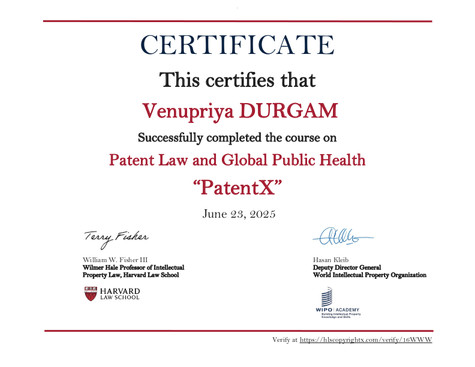 This certifies that Venupriya DURGAM successfully completed the PatentX course on 06/23/2025.