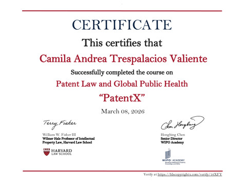 This certifies that Camila Andrea Trespalacios Valiente successfully completed the PatentX course on 03/09/2026.