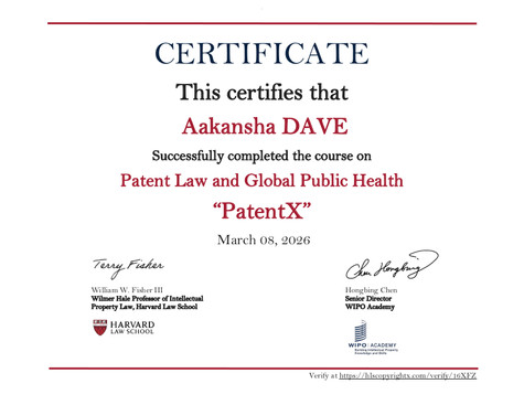 This certifies that Aakansha DAVE successfully completed the PatentX course on 03/09/2026.
