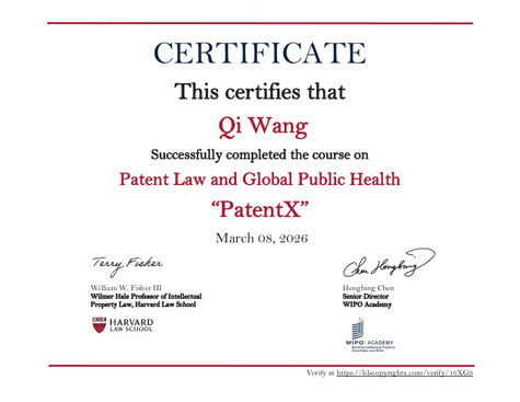 This certifies that Qi Wang successfully completed the PatentX course on 03/09/2026.