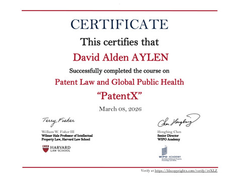 This certifies that David Alden AYLEN successfully completed the PatentX course on 03/09/2026.